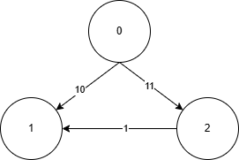 举例上面这幅图,假设从0开始加入集合S,那么下一个加入S的是1,因为10比11小,否则加入的是2。此时0到1的最短路径是10,它还有一条路径是12,可想而知那条路径不可能比10小,即使这副图再加入第三条通往1的路径,也不可能比10小。